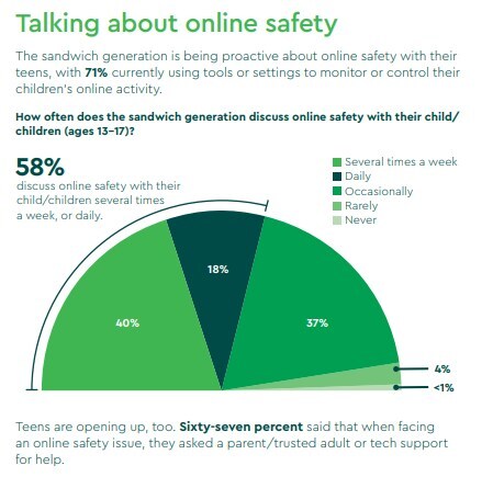 Encouragingly, most parent respondents said they already have regular, even daily, conversations about online safety with their teens. Their guidance often includes tips like creating strong, unique passwords, enabling multifactor authentication, and removing unsafe apps or channels.